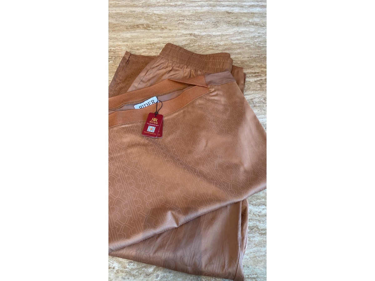 بدلة نسائية أنيقة من ماركة رايدر (Rider)، مصممة بلون بيج دافئ فاخر مع نقوش بارزة بشعار العلامة التجارية موزعة بشكل متناسق على كامل القماش، مما يمنحها لمسة فخامة وعصرية في آن واحد.